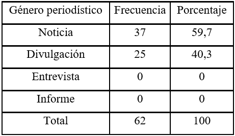 Mientras que la variable ‘género periodístico’ (variable 11), indica el tipo de redacción con el que se aborda la información comunicada, identificando el género periodístico utilizado. De esta forma, se establecieron como sus categorías: ‘noticia’ (el género más breve y clásico), ‘divulgación’ (tratamiento de mayor extensión y mayor tecnicismo), ‘entrevista’ (se considera tanto el modo pregunta respuesta como el glosado) e ‘informe’ (reúne varios segmentos informativos de distinto tipo de género por la complejidad y profundidad del abordaje otorgado por el medio).