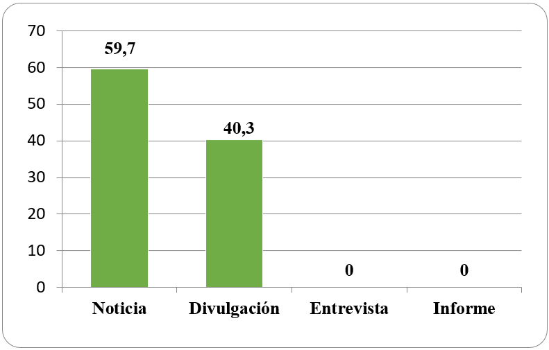 En cuanto al tipo de género periodístico elegido por las editoriales de los diarios digitales analizados para comunicar los contenidos paleontológicos publicados (Tabla 5 y Figura 5), se observa que en la mayoría de los casos se aborda la información científica mediante el género ‘noticia’ (59.7%) que representa textos con poco desarrollo, siendo la opción ‘divulgación científica’ la utilizada en los restantes casos de la muestra (40,3%), sin haberse encontrado abordajes a través de entrevistas o informes periodísticos.
