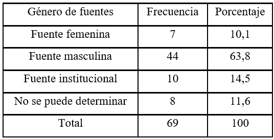 En cuanto a las variables vinculadas a la utilización de fuentes, por un lado mediante la variable ‘cantidad de fuentes’ (variable 28) se contabilizó el total de distintas fuentes utilizadas en cada información analizada. Mientras que, por otro lado, la variable ‘género de la fuente’ (variable 29) permite identificar el género de la/s fuente/s a las que se recurre para desarrollar el ítem noticioso por parte del medio periodístico. Como el ítem analizado puede tener más de un tipo de fuente, en esta variable se puede indicar más de una dimensión por cada nota analizada. Las opciones son: ‘femenina’, ‘masculina’, ‘Institucional’, o en su defecto ‘no se puede determinar’ (en los casos en que no se explicite la/s fuente/s consultada para la confección de la nota).