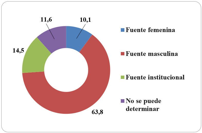 Al relevar el tipo de genero de las fuentes recurridas por los medios patagónicos al momento de abordar temáticas paleontológicas (Tabla 7 y Figura 7), se observó que prevalece la fuente masculina (63,8%), seguida de las fuentes institucionales (14,5%), sin poderse determinar el género en el 11,6% de los casos en los cuales no se hace referencia a ninguna fuente, y tan solo en el 10,1% del corpus analizado se identifica la utilización de fuentes femeninas.