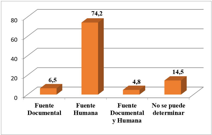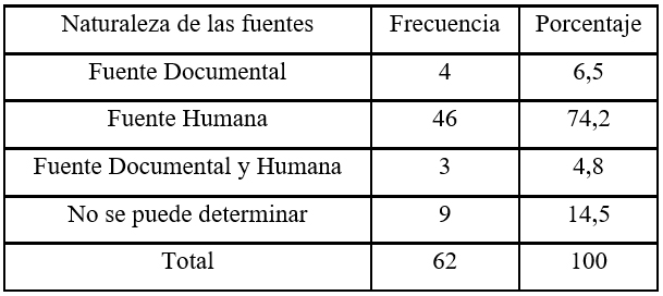 Por último, se categorizó la variable denominada ‘naturaleza de la fuente’ (variable 30) la cual permite identificar si la fuente utilizada es ‘documental’ (cuando se basa en informes, publicaciones escritas y/o documentos oficiales), ‘humana’ (en los casos que se expresa una persona en nombre de una organización, en calidad de vocero o experto), ‘documental y humana’ (si coexisten ambas opciones en el mismo ítem informativo) y ‘no se puede determinar’ (en los casos en que el redactor de la información en su enunciado no da cuenta de la naturaleza de la fuente utilizada).