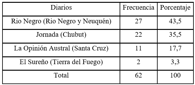La distribución de los 62 ítems informativos encontrados, (Tabla 1 y Figura 1) se concentró en mayor medida en el diario Río Negro (Río Negro y Neuquén) representando el 43,5% de la muestra, seguido por el diario Jornada al que le corresponden el 35,5% de los casos, el 17,7% de las notas fueron publicadas por el diario La Opinión Austral y encontrándose solo el 3,3% de los casos en el diario El Sureño.
