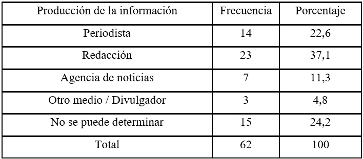 En cuanto a la variable ‘producción de la información’ (variable 08) registra el agente que produce el contenido del ítem informativo, por lo tanto, quien firma. El indicador puede adquirir como valor: ‘periodista’ (redactor con firma), ‘redacción’ (firma colectiva), ‘corresponsal’ (periodista que contribuye con el medio desde una locación distante, nacional o extrajera, siempre y cuando aparezca identificado como tal), ‘agencia de noticias’; ‘otro medio/divulgador’ (se reproduce lo publicado por otro medio sin intervención del medio analizado o en su defecto, es divulgador free lance) y ‘no se puede determinar’ (cuando no hay ningún tipo de firma).