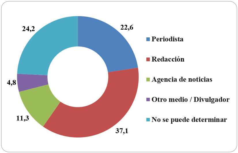 Esta variable que permite observar cual es el agente responsable de la producción de los ítems noticiosos sobre ciencia paleontológica en la muestra analizada (Tabla 2 y Figura 2), permitió observar que el 37,1% de los ítems noticiosos fue atribuido a la “redacción” del medio, y que en el 24,2% de los casos no se pudo determinar quién escribió el artículo, encontrando que solo en el 22,6% de las veces las notas fueron firmados por un periodista; mientras que el 11,3% de las veces la información fue producida por agencias de noticias y solo en una frecuencia inferior, se recurrió a otro medio y/o divulgador (4,8%).