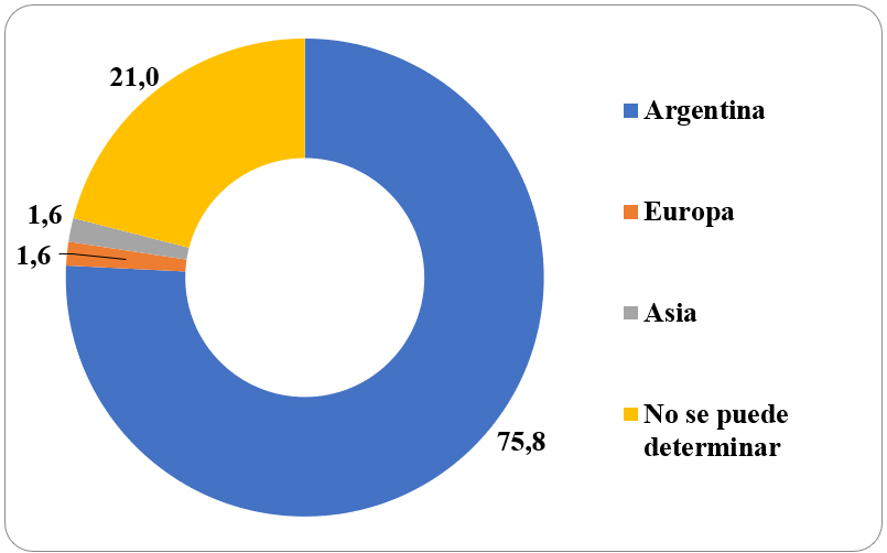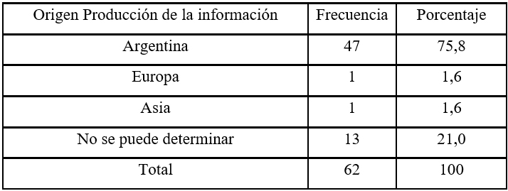 En cuanto al origen de la producción de la información (Tabla 3 y Figura 3), la gran mayoría de los ítems noticiosos relevados fueron producidos en Argentina (75,8%), mientras que no se ha podido determinar el origen de su producción periodística en 21,0% de los casos. Las dos informaciones paleontológicas restantes fueron producidas en Asia (1,6%) y en Europa (1,6%), con la particularidad, que en ambos casos fueron publicadas por el mismo medio de comunicación, el diario Jornada de la provincia de Chubut.