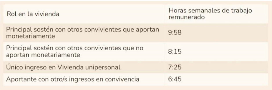Las mujeres que más horas necesitan salir a trabajar o emprender actividades de subsistencia en sus hogares son aquellas que sostienen un único ingreso de un grupo conviviente en sus hogares. En algunos casos es como madres (hogares monoparentales femeninos), en otros como responsables a cargo de padres y/o hermanos. En promedio, estas mujeres invierten casi diez horas diarias al trabajo remunerado. Les siguen las mujeres que son el principal sostén en hogares con doble o más ingresos en la vivienda. En estos casos, trabajan un promedio de 8 horas y cuarto para aportar el mayor ingreso a sus hogares. Las horas dedicadas al trabajo semanal descienden entre las que no conviven con otras personas y aquellas que no son el principal ingreso en convivencia con otros integrantes. (Tabla 2)