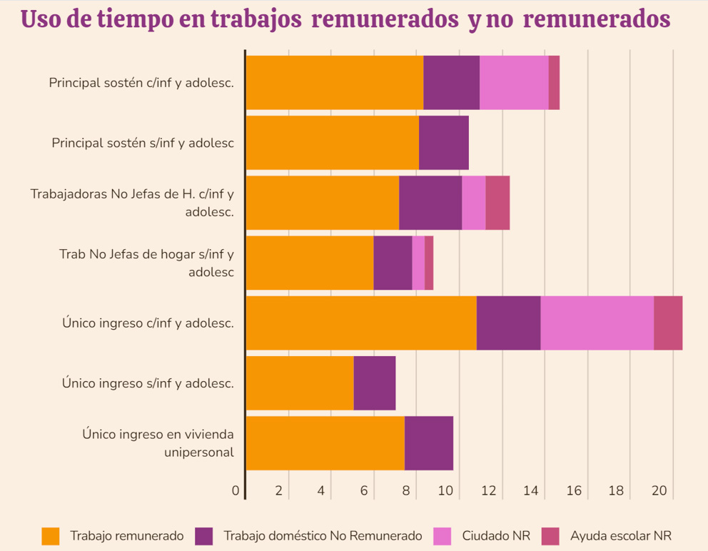 Con respecto a la inversión de tiempo de trabajo remunerado, el dato relevado marca una sobrerrepresentación en la encuesta de mujeres pluriactivas con respecto a los datos nacionales, ya que en la postpandemia la cifra de las mujeres pluriempleadas en Argentina ronda el 10% (contra el 40% de la encuesta). El tiempo invertido en generar ingresos se aumenta en líneas generales entre aquellas que conviven con infancias y adolescencias, lo que da cuenta de que como único ingreso, como principal sostén o como aportante con otros ingresos en la casa, para las mujeres de sectores populares en cualquier rol familiar es necesario dedicar más horas a trabajar remuneradamente cuando tienen a cargo hijos, hermanos, sobrinos y/o nietos. Este factor también determina que sean quienes más horas invierten en tareas domésticas y de cuidado en sus casas. Las horas de cuidado dedicadas a diario impactan decisivamente en que las jornadas queden repartidas en extensas horas entre trabajo remunerado y no remunerado.
