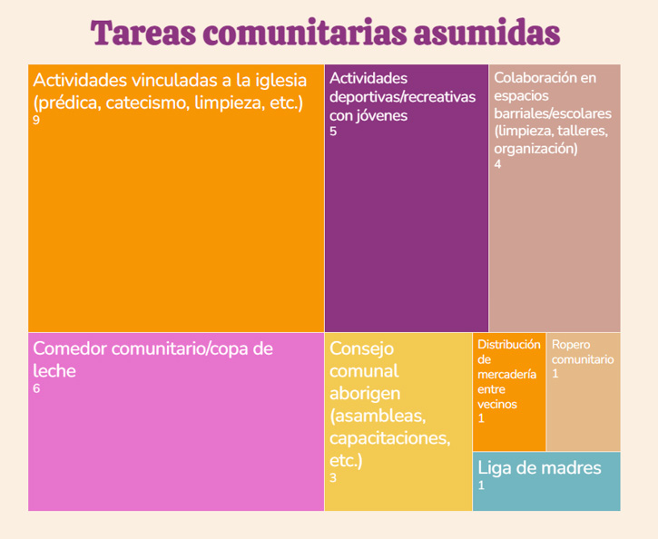 Para las tareas no remuneradas, el gráfico 4 que se muestra contabiliza solo las horas dentro del hogar, es decir, que no se calculan las horas de cuidados y responsabilidades fuera de sus hogares (a familiares a cargo pero que no conviven con ellas, por ejemplo), y las actividades de cuidado de segundo nivel, como el pago de servicios, la compra de comestibles y otros bienes de abastecimiento del hogar. Descontamos también de esta cuenta las tareas comunitarias que hicieron durante la semana, pero es trascendente el dato que prácticamente el 45% de las encuestadas hizo trabajo comunitario en copas de leche, comedores, roperos comunitarios, iglesias católicas y evangélicas, consejos de comunidades aborígenes y de organizaciones sociales, y tuvo a su cargo actividades deportivas en clubes y centros vecinales. En promedio estas tareas se llevan adelante dos días a la semana, y les requieren entre dos y tres horas de trabajo en los días que las hacen. El siguiente gráfico muestra en número y proporción el tipo de actividades comunitarias que asumen. (Figura 5)