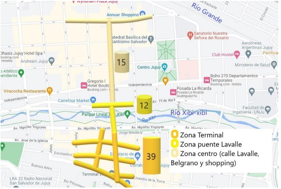 Este trazado establecido como decisión metodológica responde a la intención de rastreo y construcción de datos según el número y tipo de personas que circulan a diario entre esta región urbana construida en la investigación: la zona céntrica más conectada al puente Lavalle y la zona comercial de la ex terminal. A la selección establecida para las encuestadas -mujeres de entre 18 y 65 años que realicen alguna actividad por la que reciban ingresos- le sumamos la selección dada por lo que este espacio de ciudad supone en las actividades diarias de la población urbana jujeña de sectores populares y medios: un lugar prolífico para las actividades productivas, de consumo, financieras y comerciales, de abastecimiento familiar e individual (de alimentos y de productos varios) y en el que se realizan un diverso número de actividades de empleo y subsistencia.