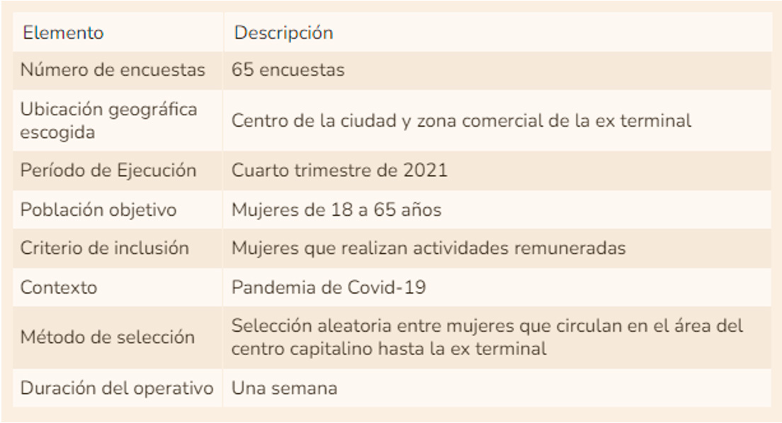 El operativo se llevó a cabo durante una semana en el cuarto trimestre de 2021, aún dentro del contexto general de la pandemia de COVID-19. En el diseño de la muestra la población objetivo fueron mujeres de entre 18 y 65 años que identifiquen realizar alguna actividad por la que reciban ingresos y que se encuentren circulando dentro de los límites demarcados entre el centro capitalino y la zona comercial de la ex terminal. Se llevaron adelante 65 encuestas seleccionadas aleatoriamente en base a los criterios expuestos (Tabla 1).