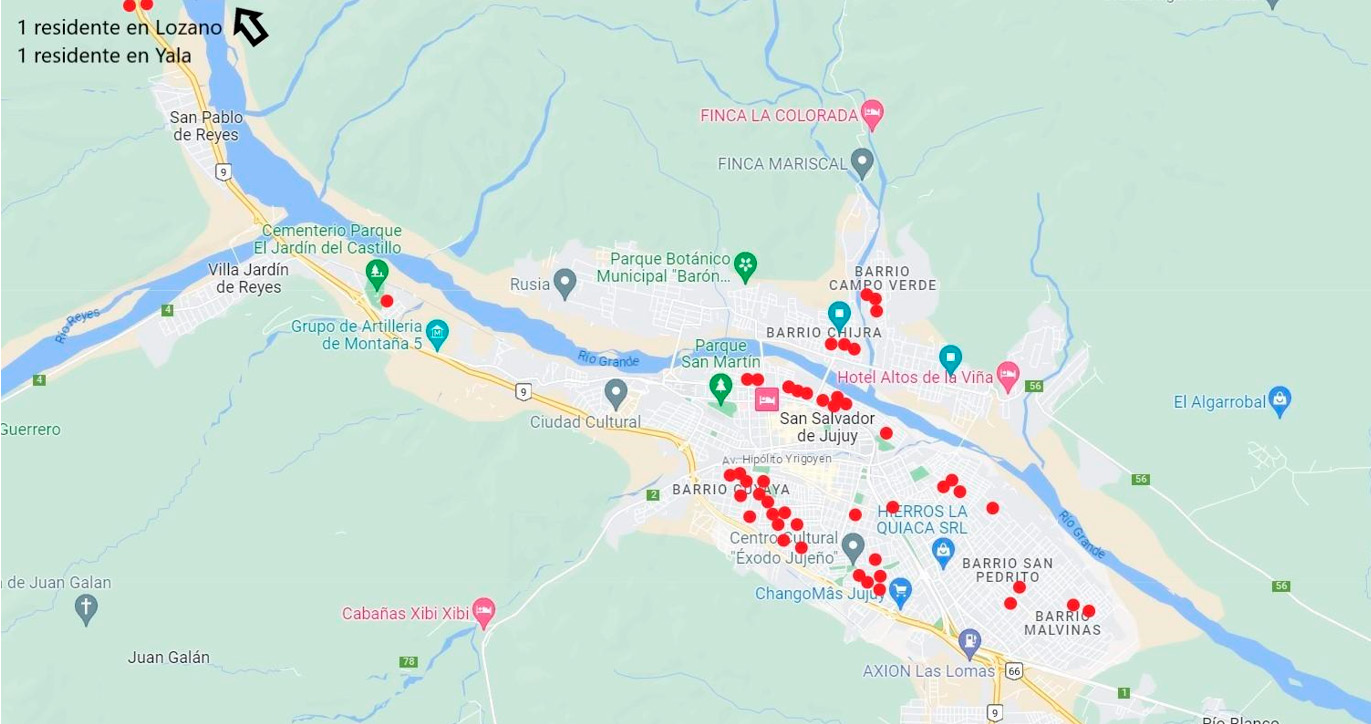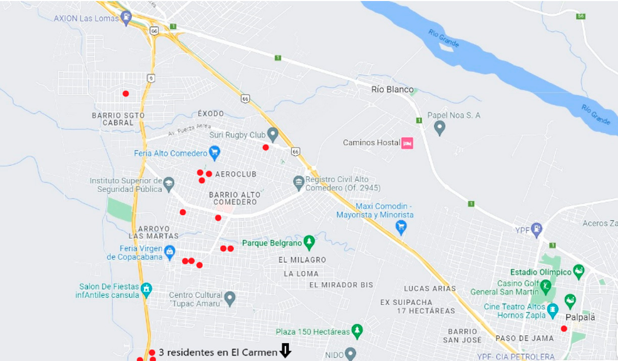 Entre las encuestadas que viven del otro lado del río Xibi-Xibi, en una distancia muy próxima al centro de la ciudad (en promedio dos kilómetros) y especialmente al centro comercial de “las latitas”, se distinguen sobre todo habitantes de los barrios de Cuyaya, Castañeda y Mariano Moreno. También se observa presencia de residentes dispersas entre las zonas sur y sudeste de la ciudad (Luján, San Pedrito, Malvinas, Coronel Arias y San Francisco), que supone una distancia un tanto mayor hacia el centro -entre tres y cuatro kilómetros. Aquellas que provienen de Palpalá, Alto Comedero y El Carmen tienen entre 7 y 26 kilómetros para llegar hasta el punto central de la ciudad, y a nivel de tiempos supone -tanto en vehículos particulares como en transporte público- un viaje de al menos 30 minutos y hasta una hora.