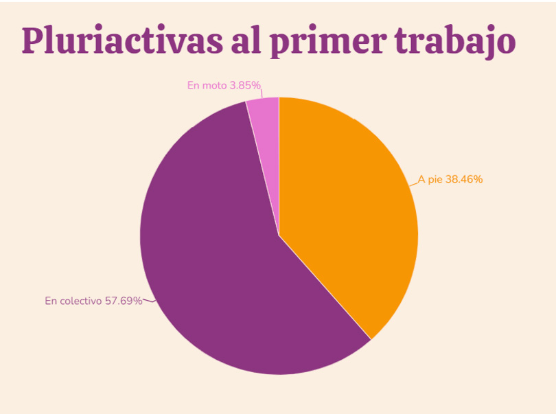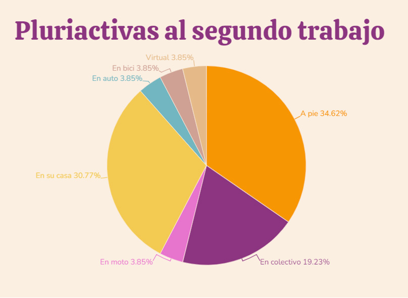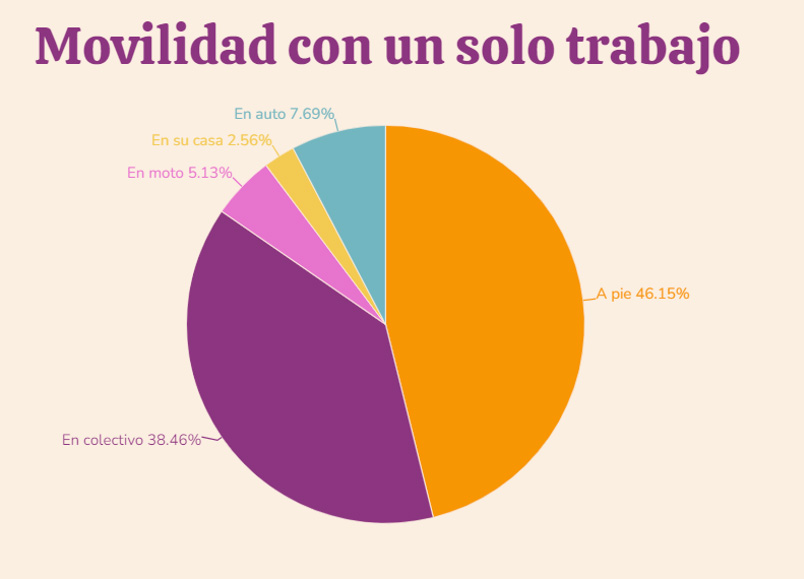 Un 40% de estas mujeres sostienen más de un trabajo durante la semana de la encuesta, por lo que, como hemos señalado, a las horas dedicadas al trabajo diario, se le deben sumar las horas de acuerdo con las dinámicas de circulación urbana elegidas entre uno o más trabajos.