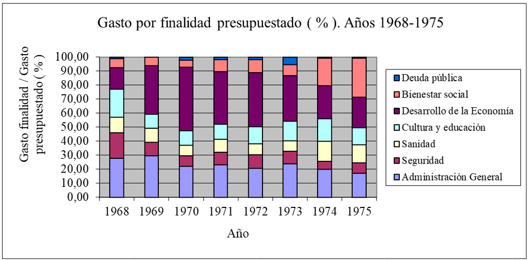 - Deuda pública: Los cargos en concepto de deuda pública aumentaron y alcanzaron su máximo en el año 1973 con un 5.47 %. Podría interpretarse que en ese año hubo que realizar pagos de servicios de la deuda pública.