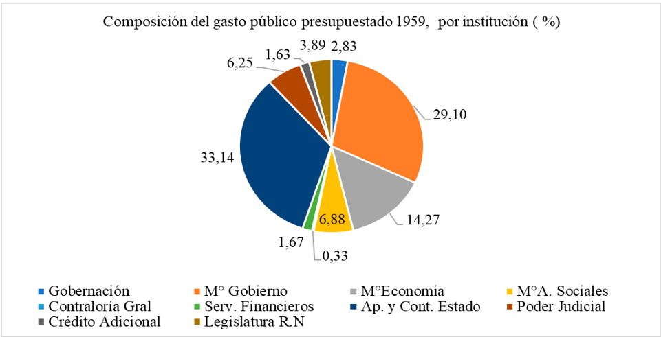En el año 1958 asumió el primer gobernador provincial, el Dr. Castello y “En el corto plazo, la prioridad era darle una estructura institucional técnica y administrativa a la provincia, ejecutar la Constitución Provincial y articular las diversas regiones entre si, aisladas por las grandes distancias y déficits notables en infraestructura comunicacional” (Ruffini 2013: 4). En ese año se crearon la Dirección General de Personería Jurídica en el Ministerio de Gobierno9, la Dirección de Vialidad de Río Negro y la Dirección General de Asistencia Social en el Ministerio de Asuntos Sociales10. El 20 de diciembre de 1958 se sancionó la Ley Provincial Nro. 47, que fijó el presupuesto general de gastos y de recursos destinados para el año 1959. En la figura 1 pueden observarse las erogaciones presupuestadas por institución, en donde el 14,27 % fue destinado al Ministerio de Economía11, el 29,10 % al Ministerio de Gobierno y el 33,14% correspondió a la partida “Aportes y contribuciones del Estado”, es decir, erogaciones previstas para organismos autárquicos y otros no especificados. Cabe destacar además que el 47% de ese gasto público fue presupuestado para personal. Al Poder Judicial se le asignó el 6,25 % y por Ley 39 de 1958 se estableció que estaría ejercido por el Superior Tribunal de Justicia, los Jueces letrados y los Jueces de Paz como así también la existencia de tres circunscripciones judiciales12. Por último, la Secretaría General de la “Gobernación”13 representó el 2.83 % del gasto presupuestado.