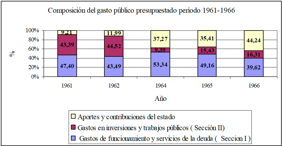 En el año 1960, se constituyó el régimen contable, financiero y presupuestario de Río Negro como así también la organización de la Contraloría General. La Ley Provincial 170, en su artículo 5° del capítulo I 14, estableció la estructura general del presupuesto. Dispuso dos partes, una sobre gastos y otra referida al cálculo de recursos de la Administración Central. La primera de ellas se dividió en la Sección 1ra llamada “Presupuesto de Gastos”, conformada por el título I “Gastos de Funcionamiento”15 y por el título II “Servicios de la Deuda Pública” y en la Sección 2da nombrada “Presupuesto de inversiones patrimoniales”16, cuyo título I era “Inversiones” y el Título II “Trabajos Públicos”. La segunda parte se refirió a los recursos, a los que separó en secciones: de rentas generales, de uso del crédito y especiales.