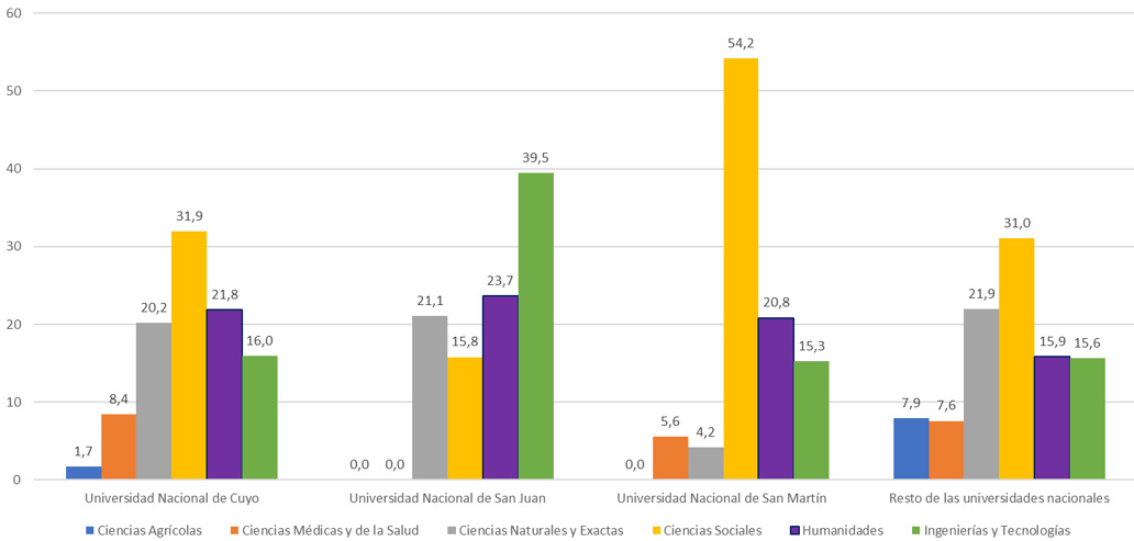 Las Humanidades se ubican en el segundo lugar en los tres casos estudiados, aunque a nivel nacional este puesto es ocupado por las Ciencias Exactas y Naturales; la UNSJ sobresale por el escaso desarrollo de las Ciencias Sociales que ocupan el último lugar en relación con el resto de las disciplinas profundamente opuesto a la situación en la UNSAM.