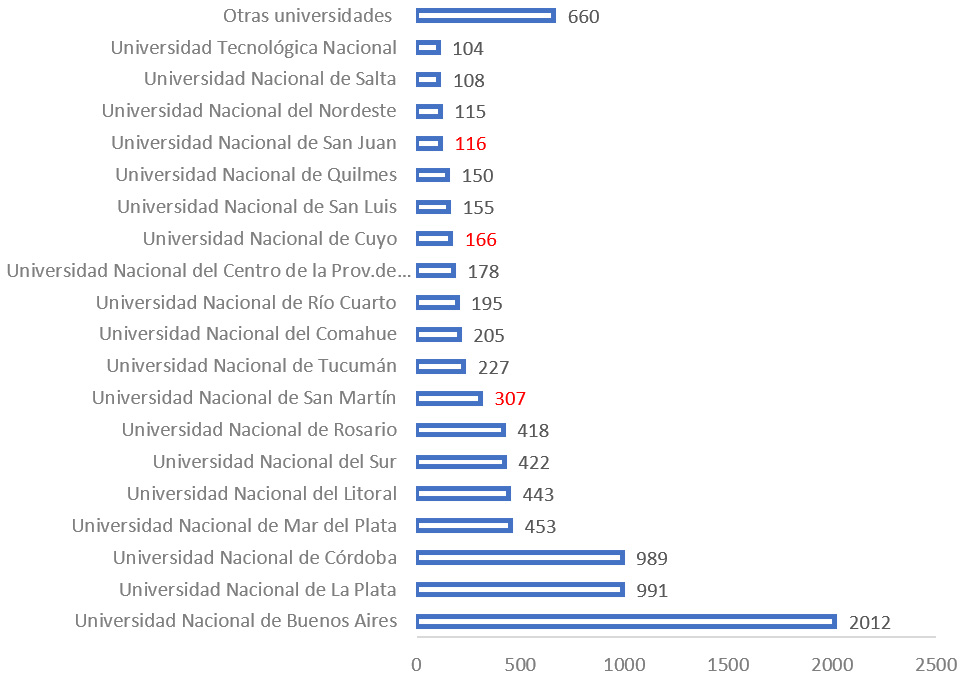 Respecto de los docentes categorizados en el (PROINCE) los datos corresponden a 2019 y son agentes que pueden o no pertenecer al CONICET. Estos datos muestran el volumen de docentes categorizados por universidad, es decir, docentes que realizan investigación, que forman parte de un proyecto acreditado por la universidad y que atravesaron un proceso de evaluación de sus trayectorias por pares evaluadores. El Gráfico 9 expresa esta distribución por universidades mostrando que la UNCUYO representa el 3% sobre el total de categorizados del país, la UNSJ el 2,4% y la UNSAM el 1,2%.