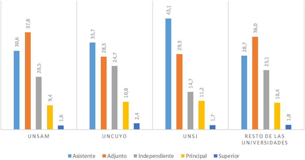 • En relación con los investigadores/as del CONICET que tienen un cargo docente y lugar de trabajo en una universidad, a nivel nacional observamos una profunda concentración en las tres universidades más grandes y antiguas del país: Universidades Nacionales de Buenos Aires, La Plata y Córdoba. Entre los tres casos estudiados la UNSAM es la que mayor proporción de investigadores concentra y en la categoría Adjunto que habilita y exige la formación de recursos humanos y la dirección de proyectos de investigación; a pesar de ser la institución más reciente. Le sigue la UNCUYO con una distribución piramidal: una base ancha de categorías iniciales y un achicamiento a medida que aumenta la jerarquía. Finalmente, la UNSJ tiene más del 40% de investigadores en la categoría inicial, Asistentes, lo cual indica el reciente proceso de incorporación a la institución de docentes que son investigadores del CONICET (a excepción de la facultad de Ingeniería).