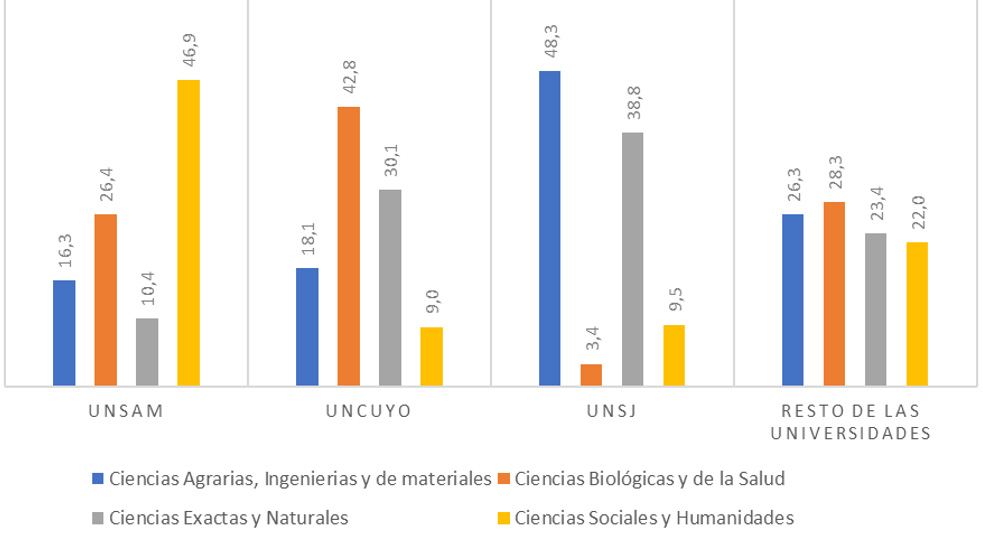 El caso de la UNCuyo se presenta como el de mayor diversificación disciplinar y mayor equilibrio relativo. Se destaca el desarrollo de las ciencias médicas que supera a la media nacional y las ciencias agrícolas, cuya explicación radica en la génesis de esta universidad muy ligada al Instituto del Vino y la creación temprana de la Facultad de Ciencias Agrarias.