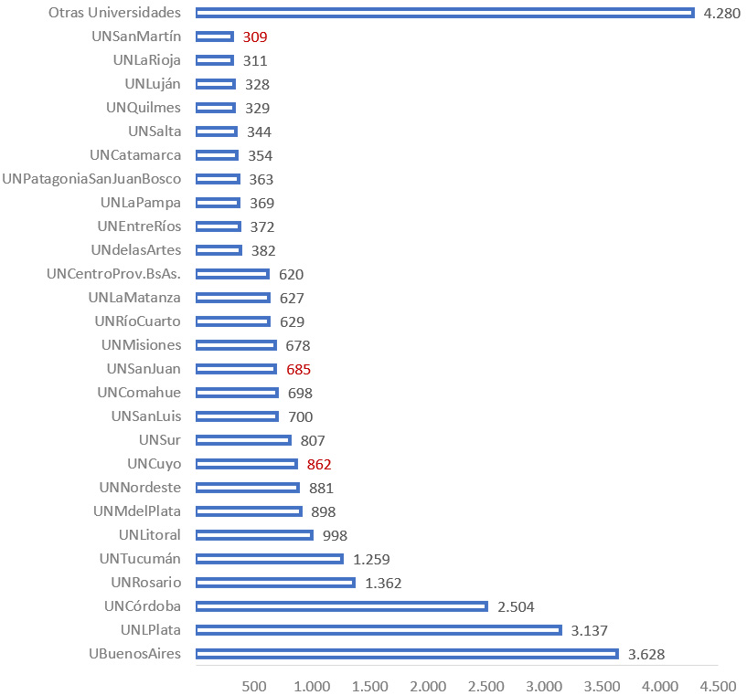 La escisión estructural entre investigación y docencia ha dejado a la mayoría de las universidades alejadas de la función de investigación. En términos generales, según las últimas estadísticas universitarias disponibles sobre un total de 142.464 docentes universitarios sólo el 12,6% ha realizado una formación doctoral y sobre un total de 208.476 cargos docentes sólo el 10,5% corresponde a una dedicación exclusiva, entre cuyas exigencias se encuentran las actividades de investigación (SPU 2022). Sin embargo y a pesar de la deuda que las universidades aún tienen con la investigación, al interior del sistema universitario encontramos una profunda heterogeneidad y diversidad y, precisamente, nuestro estudio estuvo orientado a la búsqueda de esas particularidades y complejidades que conforman la estructura del conjunto.