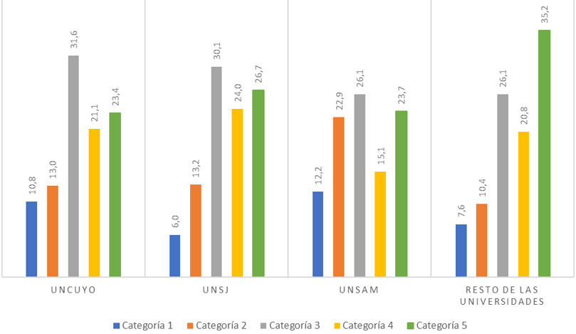 • Los docentes categorizados en el PROINCE representan una proporción más elevada en la UNCUYO comparada con las otras dos, seguida de la UNSJ donde predomina la categoría intermedia y finalmente la UNSAM que -al contrario de la tendencia con los investigadores de CONICET- es la que tiene menor cantidad de docentes categorizados en el PROINCE pero de mayor categoría, lo cual indica nuevamente que en esta universidad predominan los docentes formados en la investigación.