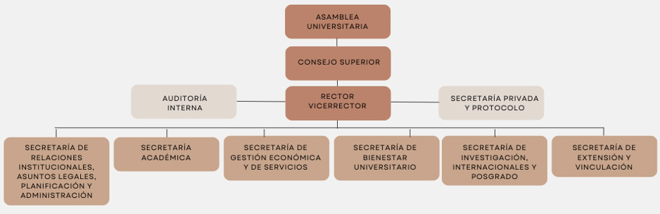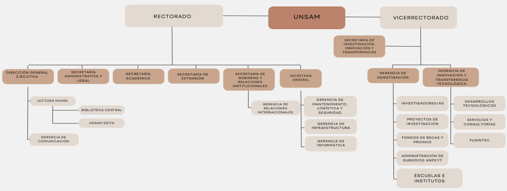 La estructura organizativa refleja una fuerte jerarquización de las actividades de investigación, que dependen de la Secretaría de Investigación, Innovación y Transferencia (SIIT) bajo el vicerrectorado siendo la única área de la cual se ocupa esta oficina (Figura 3). La SIIT está dividida en dos gerencias que se ocupan por una parte de la investigación y por otra de la innovación y transferencia tecnológica.
