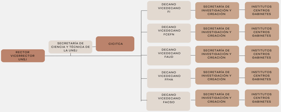 Las actividades de investigación se despliegan en la Secretaría de Ciencia y Técnica en el ámbito del Rectorado (Figura 2). De la secretaría depende el Consejo de Investigaciones Científicas y Técnicas y de Creación Artística (CICITCA) integrado por los cinco secretarios de investigación de las Facultades y presidido por el mismo secretario, con la finalidad de organizar la función de investigación de acuerdo con la política científica predefinida y regular los diferentes instrumentos para su cumplimiento. Está a cargo de otorgar subsidios internos a grupos de trabajo; la administración del programa de becas de investigación; la gestión de las categorizaciones de los docentes integrados al PROINCE; y de subsidios externos destinados a la promoción de las actividades de CyT. Por su parte, las secretarías de investigación de cada Facultad se encargan principalmente de identificar demandas y necesidades del medio en vistas a potenciar el alcance de la investigación, a la vez que entienden en los procesos de ejecución y evaluación de los proyectos y becas de investigación.