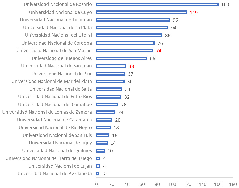 • Comparativamente la UNCUYO es la institución que mayor cantidad de espacios de investigación posee en relación con las otras dos casas de estudios. Aunque esto no indique estrictamente mayores capacidades de investigación.