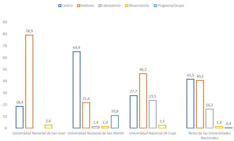 El Gráfico 2 nos muestra que tanto a nivel nacional como en las tres universidades bajo estudio los centros e institutos prevalecen como estructuras que sostienen el desarrollo de las actividades de investigación. En la UNCUYO y UNSJ predominan los institutos, 46% y 79% respectivamente; mientras que en la UNSAM los centros representan el 65 % del conjunto de espacios de investigación.