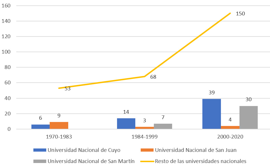 CECIC (2021)Nos resultó inaccesible conocer el año de creación para la mayoría de los espacios de investigación, aunque relevamos 453 casos que nos permite mostrar una tendencia general. Tanto a nivel nacional como en la UNCUYO y la UNSAM el último periodo, entre 2000-2020, muestra una fuerte expansión, mientras que en la UNSJ el periodo de mayor creación fue entre 1970 y 1983. En la UNCUYO se ha sostenido un predominio de estructuras dependientes exclusivamente de la universidad, sin embargo, hubo un leve crecimiento de espacios de doble dependencia Universidad-CONICET durante el periodo 2000-2020. La UNSJ durante el mismo periodo conformó centros de doble filiación UNSJ-CONICET importantes como el Centro de Investigaciones de la Biosfera y Geosfera (CIGEOBIO) que reúne la mayor proporción de investigadores/as y becarios/as del Consejo con lugar de trabajo en la UNSJ. En la UNSAM, durante la etapa inicial predominó la creación de institutos de doble dependencia UNSAM-Organismo científico-tecnológico lo cual refleja la estrategia asociativa implementada en sus comienzos; tendencia que va disminuyendo en periodos cercanos donde se crearon centros dependientes exclusivamente de la universidad como expresión del proceso de consolidación institucional (Gráfico 4).