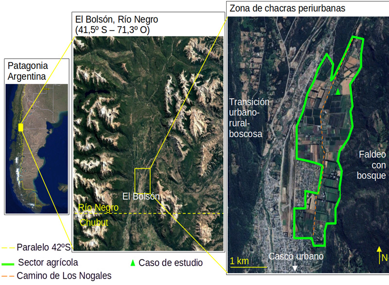 Muchos de estos productores neorrurales agroecológicos alquilan la tierra en la zona agrícola histórica del Camino de los Nogales, ubicada a 5 km del centro de la ciudad de El Bolsón (Figura 1). Esta zona tiene una trayectoria agropecuaria desde los inicios del siglo XX, donde la actividad agrícola cumplió un rol primordial en la producción de trigo y otros cereales para proveer de harina a la localidad, a la Meseta rionegrina (Región Sur de la provincia de Río Negro) y a la Región del Nahuel Huapí donde hoy se ubica San Carlos de Bariloche (Méndez 2013). Hoy el sitio se caracteriza por los cultivos de fruta fina, lúpulo, horticultura y manejo intensivo de pasturas para lácteos. Además, es la zona más productiva de El Bolsón por sus suelos profundos, drenados, ricos en materia orgánica y un microclima privilegiado, potenciado por grandes arboledas de álamos y nogales (IICA 2013).