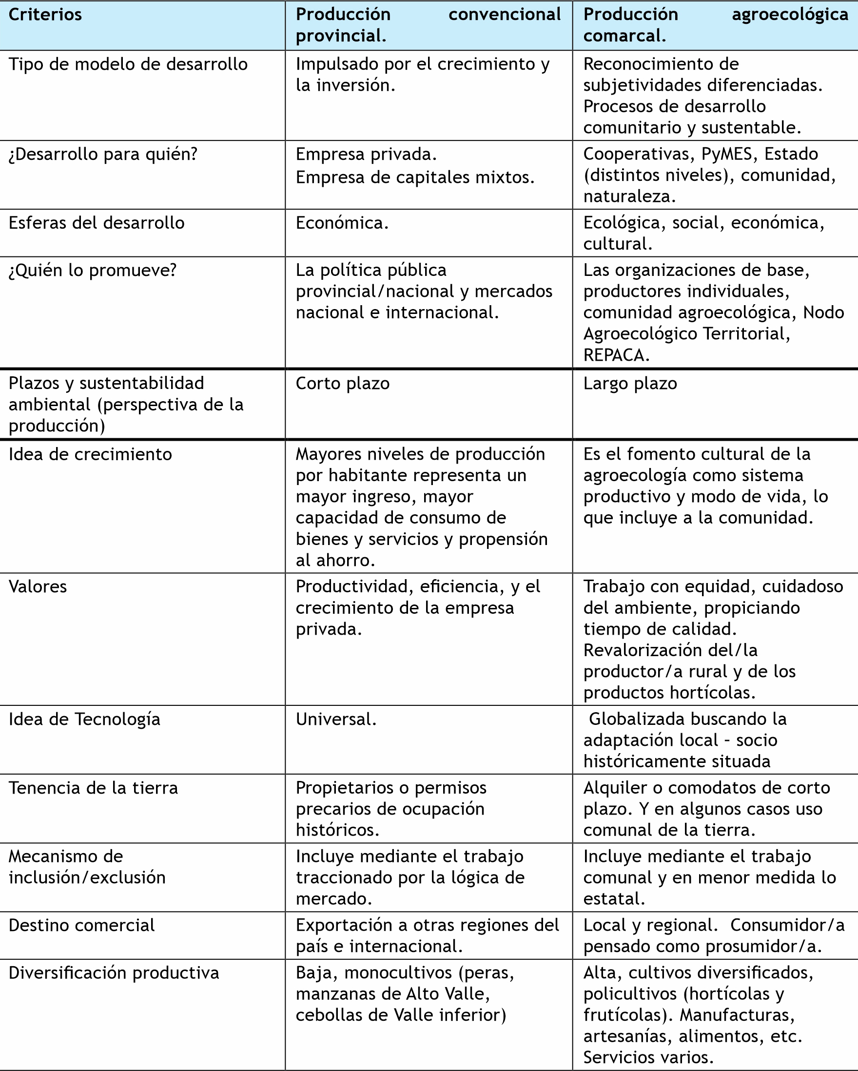 7. Valores: para el modelo provincial/municipal los principales valores son productividad, eficiencia, y el crecimiento, mediante el aumento de la productividad, de activos y utilidades e incorporando tecnologías de conocimiento intensivas, lo que impulsa la innovación y el incremento de los ingresos. En oposición, el modelo agroecológico valora la recuperación del trabajo reproductivo simple de qué y cuánto es necesario producir y con ello se modifica el patrón de consumo, esto es, trabajo con equidad, cuidadoso del ambiente, propiciando tiempo de calidad, donde se revaloriza el/la productor/a rural y la valorización de los productos hortícolas. También, buscan comercializar sus productos a un precio justo, y el valor de cada hortaliza muchas veces se basa en el esfuerzo en producir en un sistema productivo agroecológico.