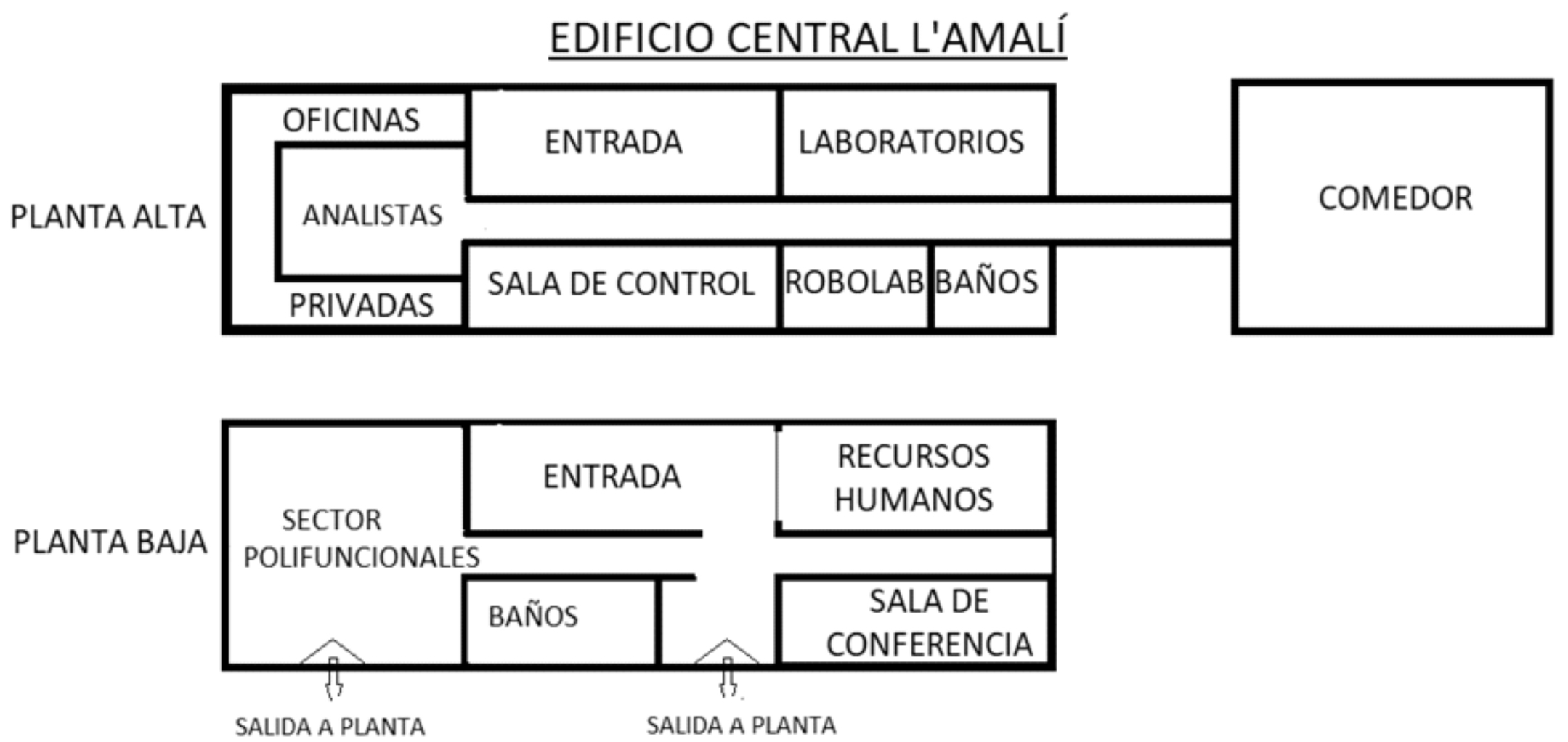 El edificio central de L’Amalí es una construcción de aproximadamente 90 metros de largo y 20 de ancho, que funciona como ingreso a la fábrica. El hall de entrada es amplio y luminoso. A la izquierda se encuentra una especie de mostrador que separa el ambiente del área de recursos humanos. El diseño le permite al personal de ese sector tener la amplitud visual hacia las principales vías del edificio central: la entrada, los pasillos y la escalera que conecta cada sector. A la derecha de la puerta de entrada hay una maqueta de la planta y encima, colgados dos carteles con el nombre -en color negro- del personal que se desempeña en la empresa. Solo nombres y apellidos, no explicitan puestos de trabajo. En la lista hay 24 nombres en gris, son los trabajadores que se emplean desde la apertura de la planta, hace más de 20 años: todos varones. En L’Amalí, los escalafones se organizan en una pirámide de 4 niveles: en la base se encuentran los y las operarias, le siguen analistas y luego coordinadores. En la cúspide se posiciona el equipo de conducción, estos son: líderes y gerente de producción.
