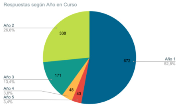 El relevamiento recabó 2016 respuestas. Entre ellas, 1384 corresponden a estudiantes del IDEI (un 68,3%). Existe una preponderancia en la participación de la encuesta de los años iniciales. Este peso relativo se refleja de forma similar en la estructura general de inscriptos en la Universidad. En conjunto, 1er y 2do año acumulan el 79,4% de las respuestas. Los años más avanzados suman un total de 262 casos, en donde 4to y 5to año están representados por 48 y 43 respuestas, respectivamente.
