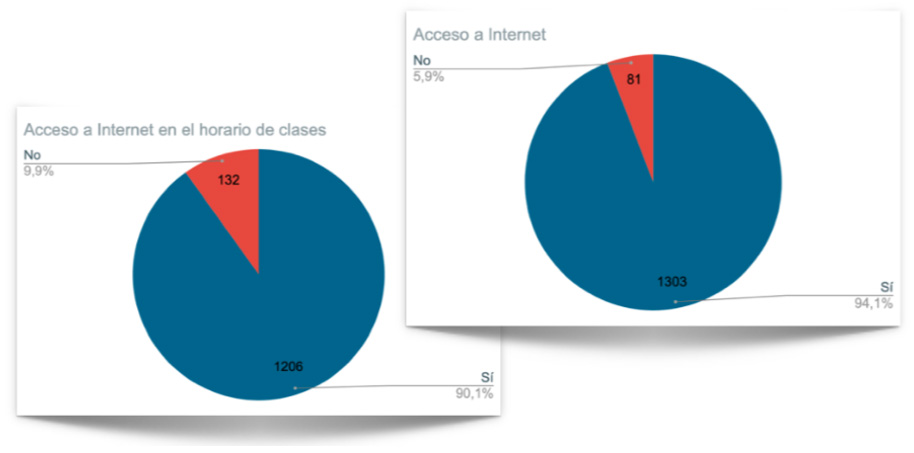 En cuanto al acceso a internet de los estudiantes los resultados nos muestran, que ronda el 94%. Esto implica que, dentro del Instituto, el 5,9% (81 casos) de nuestros estudiantes no disponen de conectividad para acceder al acompañamiento virtual (Gráfico 1).