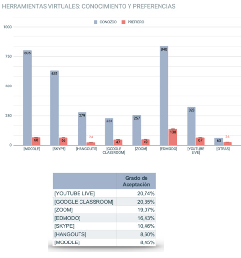 Al indagar sobre las herramientas virtuales, los estudiantes respondieron acerca de qué tipo de plataformas o programas les resultan más conocidos. Los de mayor importancia fueron Edmodo (840 casos), Moodle (805 casos) y Skype (631 casos).