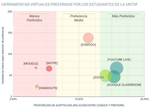 Del gráfico se observa a continuación, se destaca que existen herramientas y plataformas que tienen una amplia difusión, pero que no son preferidas por los estudiantes. Moodle, Skype y Hangouts, son los casos que se ubican en este segmento. Esto deja advertir que la popularidad y la difusión institucional de algunas tecnologías específicas pueden no responder de manera práctica a las necesidades de los estudiantes. En contrapartida, las herramientas de mayor preferencia relativa son Youtube Live, Google Classroom y Zoom. Esta información representa un valioso elemento para la definición y/o adaptación de propuestas de interacción virtual tanto para la UNTDF como para otras instituciones que perciban un perfil de características similares.