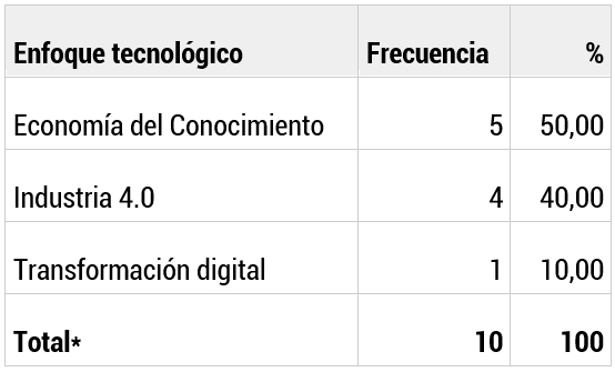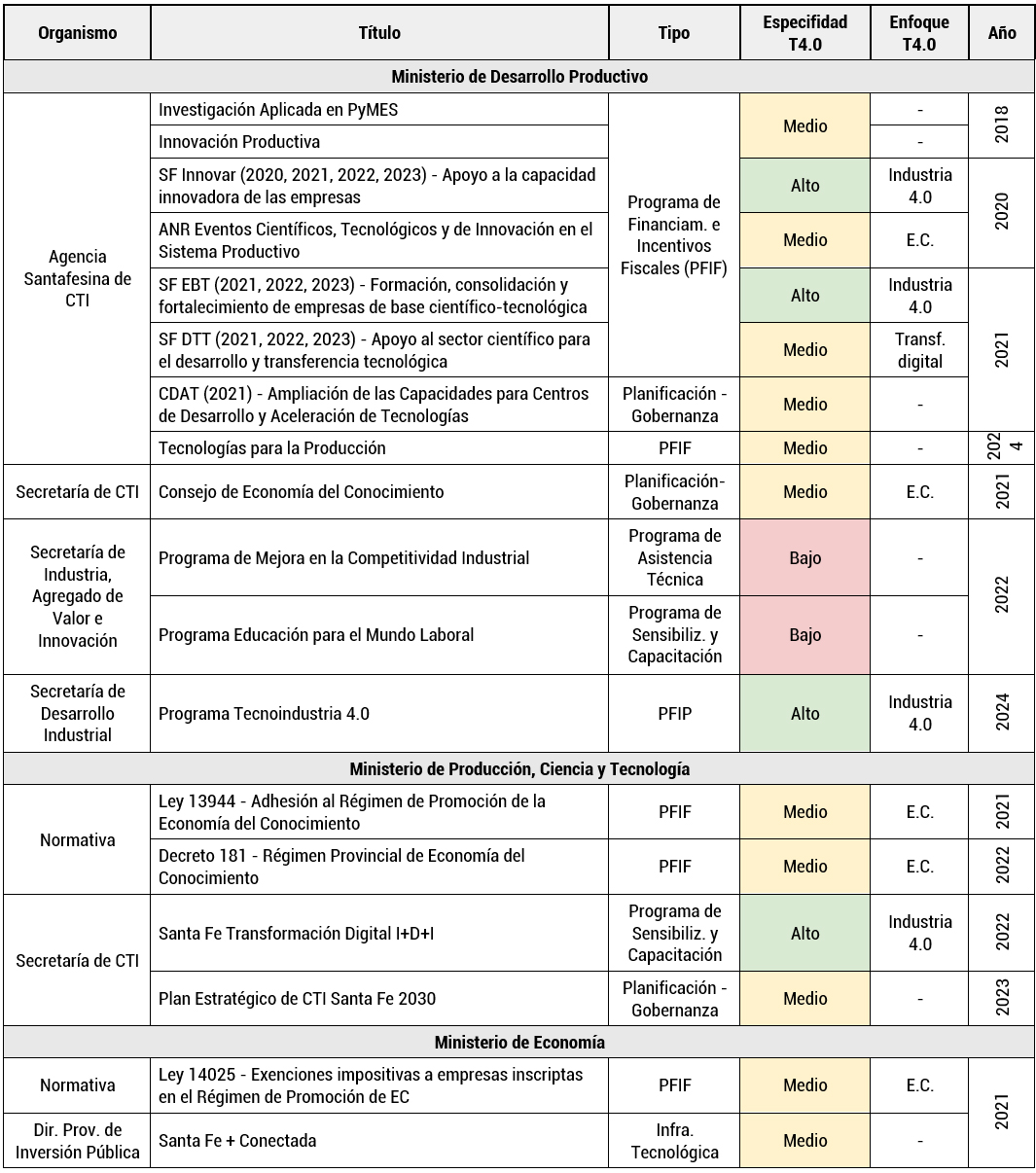 Un elemento particular que se observa en la provincia de Santa Fe es que los instrumentos no invocan de modo explícito a vectores tecnológicos particulares que componen al paradigma 4.0. A nivel nacional, por ejemplo, en 2022 se lanzó el Programa de Promoción de Inteligencia Artificial y Ciencia de Datos; en 2023 el Plan de Fortalecimiento del ecosistema, promoción del desarrollo y adopción de nuevas aplicaciones basadas en inteligencia artificial; o la creación de la Mesa Interministerial de Inteligencia Artificial en el mismo año. Por el contrario, en Santa Fe, el 50% de los instrumentos que hacen referencia a algún sector o actividad que puede estar asociada con dicho paradigma, refiere genéricamente a la “economía del conocimiento”, el 40% a la “industria 4.0” y el 10% a la “transformación digital” (Tabla 7).