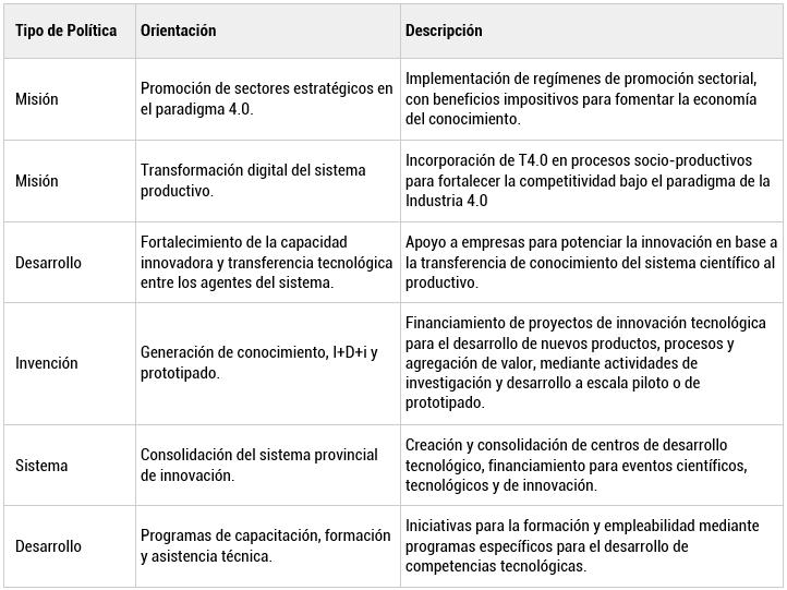 En los últimos años, se implementaron distintos instrumentos que contribuyen a la promoción de las T4.0 en la provincia. Sus orientaciones, rasgos, objetivos y destinatarios son variables; algunos se vinculan de forma estrecha con vectores 4.0, mientras que otros, sin hacerlo de forma explícita, los contemplan, en tanto que persiguen la incorporación de tecnologías digitales y la transformación digital para aumentar la competitividad de la producción.