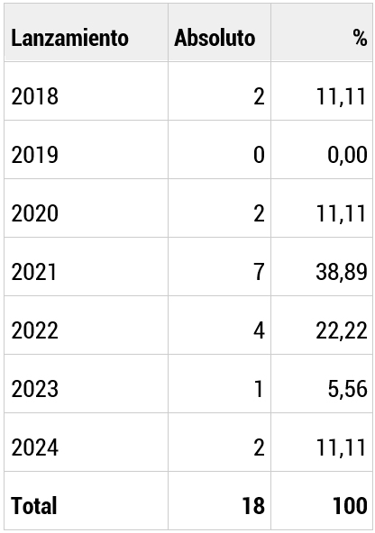 Entre los años 2018 y 2024 se identificaron 18 instrumentos, siendo 2021 el año que concentra el lanzamiento de la mayor cantidad de iniciativas, con el 38,89% (Tabla 1). Es de notar que diversas convocatorias fueron reeditadas anualmente durante el período analizado, pero sólo son contabilizadas en el año que se identifica como el del lanzamiento.