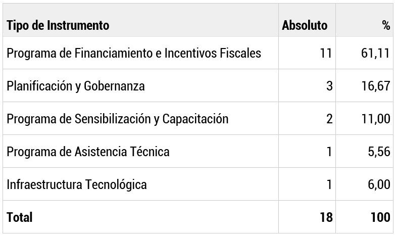 Los instrumentos predominantes fueron de financiamiento e incentivos fiscales (61,11%), en su mayoría bajo la modalidad de ANR, para el cumplimiento de distintos objetivos. El resto de las acciones muestran una mayor dispersión (Tabla 2).