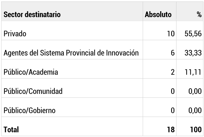 Entre los destinatarios, las políticas recayeron con gran énfasis en el sector privado de forma exclusiva (55,56%), aunque también se destaca el carácter transversal de las acciones, enfocadas a los agentes del sistema provincial de innovación (33,33%), lo que revela un gran esfuerzo destinado a la construcción de vínculos asociativos entre éstos (Tabla 3).