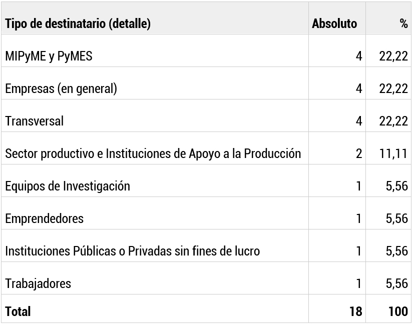 Una mirada en detalle sobre los destinatarios indica que el 22,22% se enfoca en empresas MIPyME y PyMES. En igual proporción, las políticas se destinan a empresas en general, así como también existen numerosas políticas con un carácter transversal, que incluyen a diferentes agentes. También se registran políticas destinadas a estrechar lazos y fortalecer las capacidades del sector productivo y las instituciones de apoyo a la producción (11,11%), entre otras (Tabla 4).
