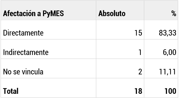 Un elemento que se destaca es la alta afectación a PyMES de las políticas, lo que demuestra una clara orientación hacia el desarrollo de capacidades innovativas y tecnológicas de uno de los principales agentes que componen el sistema productivo provincial. Sólo el 11,11% de los instrumentos identificados no se vincula directa ni indirectamente con este tipo de unidad productiva (Tabla 5).
