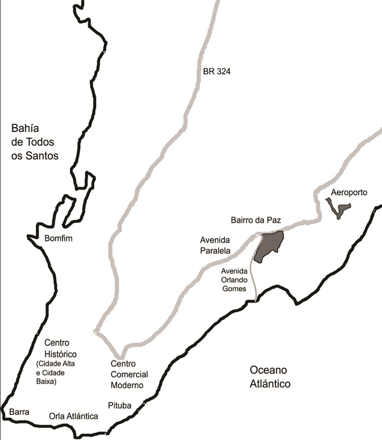 Em sua fase mais recente de modernização, Salvador, uma cidade que se aproxima rapidamente do bloqueio total de seu trânsito, está desenvolvendo novos sistemas de transporte, combinando novas rodovias de cruzamentos com sistemas Bus Rapid Transit (BRT) e Veículos Leves sobre Trilhos (VLT), além de uma nova linha do metrô já existente, para conectar parte do antigo centro ao aeroporto internacional, colocando suas pistas e estações no centro da rodovia principal, a Avenida Paralela. O Bairro da Paz está localizado no cruzamento entre essa via e a Avenida Orlando Gomes, transversal que liga a Paralela à Avenida Octávio Mangabeira, que passa pela Orla Marítima (vide Mapa 1). Uma nova estação de metrô estava sendo construída, a ser inaugurada em setembro de 2017, o que significa que novas pistas e viadutos serão também construídos a partir desse novo entroncamento entre as avenidas citadas. Essas obras implicaram a remoção de alguns moradores do Bairro da Paz, mas os novos sistemas de transporte não constituem o único aspecto da situação atual que preocupa alguns de seus atuais moradores, pois eles continuam preocupados com a segurança futura na posse de suas casas.