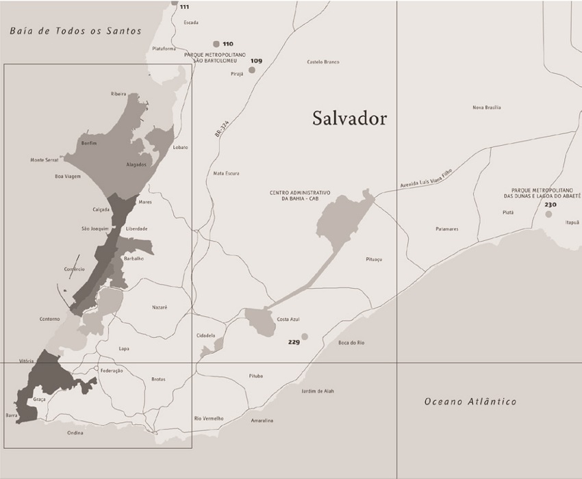 O boom imobiliário do século XXI, em Salvador, é visível tanto em áreas residenciais de luxo, bem estabelecidas, como em prédios de apartamentos modestos, construídos para beneficiários do programa Minha casa, minha vida. Porém sua manifestação mais visível se encontra nos pontos de entrada Norte da cidade (vide Mapas 1 e 2). Ali, novos shoppings e condomínios residenciais são nitidamente associados a espaços que buscam oferecer aos soteropolitanos mais abastados uma “vivenda segura”, com toques de verde, apesar da crescente destruição extensiva da Mata Atlântica que o desenvolvimento dessa região provocou. Localizada entre o aeroporto internacional e o Centro Administrativo da Bahia (CAB) – que ACM inaugurou em 1972, durante seu primeiro mandato de Governador –, essa zona norte já se tornou outro novo “centro”, o mais moderno de uma cidade cada vez mais “poli(multi)nucleada” (Santos, 2013).