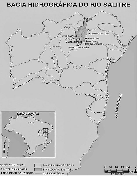 A bacia hidrográfica do Rio Salitre está localizada ao norte do Estado da Bahia, em região de clima semiárido que integra o chamado Polígono das Secas no Nordeste brasileiro. A bacia possui 13.467,93 km2 de área de drenagem, isto é, de área para onde as águas das chuvas convergem, formando o rio principal e seus afluentes, com 640 km de perímetro, cujos limites integram parte de oito municípios – Jacobina, Juazeiro, Miguel Calmon, Morro do Chapéu, Ourolândia, Campo Formoso, Mirangaba e Umburanas – e, integralmente, o município Várzea Nova1 (Figura 1).