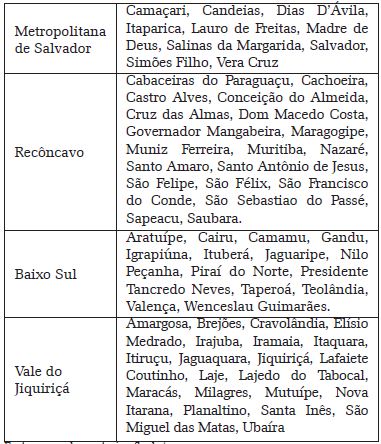 Pela Figura 2, pode-se perceber que os possíveis impactos do SVO vão além dos territórios do Recôncavo e do Baixo Sul e, por essa razão, serão aqui prospectados, além desses dois, os territórios do Vale do Jiquiriçá e da Região Metropolitana de Salvador. Serão utilizados dados sobre população, PIB e PIB per capita, emprego e indicadores de desempenho econômico e social. O Quadro 1, a seguir, relaciona os municípios que formam cada um dos quatro territórios.