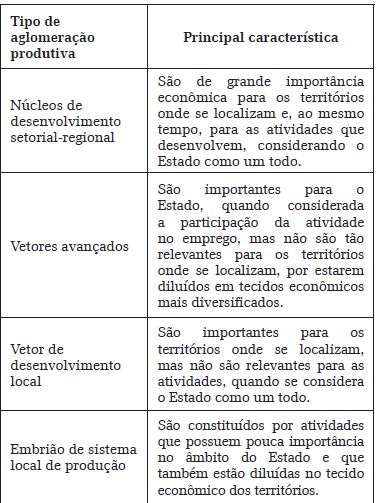 Teixeira e Araújo (2011) identificaram as aglomerações produtivas de todos os Territórios de Identidade do Estado da Bahia, com base nos dados de empregos constantes da RAIS Estabelecimentos e de acordo com metodologia também nele utilizada. As aglomerações foram classificadas em quatro tipos, conforme resumo apresentado no Quadro 2.