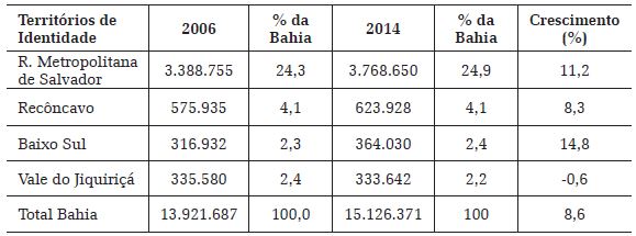 A Tabela 1 apresenta a população dos Territórios de Identidade que estão sendo analisados, bem como o percentual da população de cada um em relação ao Estado e o crescimento em cada um, de 2006 a 2014. Nota-se que as populações da Região Metropolitana de Salvador e do Baixo Sul cresceram acima da média de 8,6% do Estado, enquanto os dois outros territórios cresceram abaixo dessa média. Chama atenção o crescimento negativo da população do Vale do Jiquiriçá,10 indicando a possibilidade da existência de um êxodo desse território pela falta de oportunidades de emprego, uma vez que a relação entre empregos formais e população, em 2006, era de apenas 4,8%, enquanto, na RMS, atingia 25,1%, no Recôncavo 10,9% e no Baixo Sul 6,3%. Portanto, a RMS continua atraindo novos habitantes, pela oferta de empregos, assim como o Baixo Sul, pelo emprego vinculado ao crescimento do turismo, uma vez que a relação entre população e empregos, nesse território, cresceu para 8,7% em 2013 (ver Tabela 3).